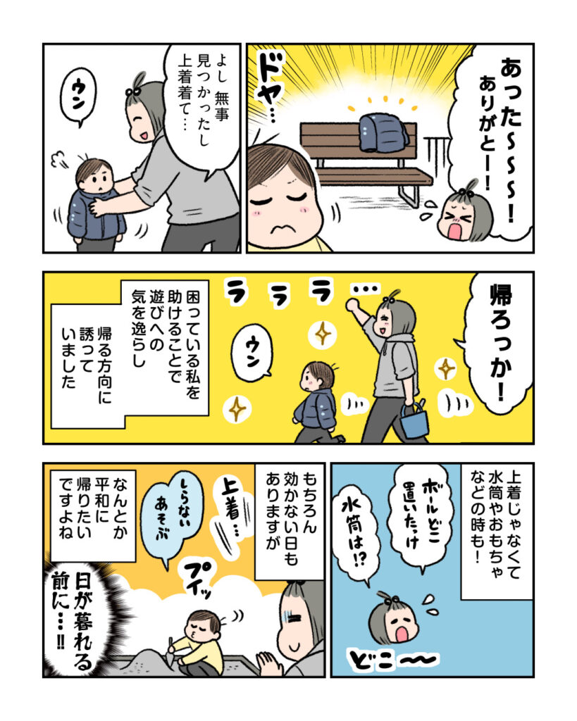 上手に対策をしてスムーズに帰れれば、お出かけや公園遊びもより楽しめそうですね!みなさんもぜひ試してみてくださいね。